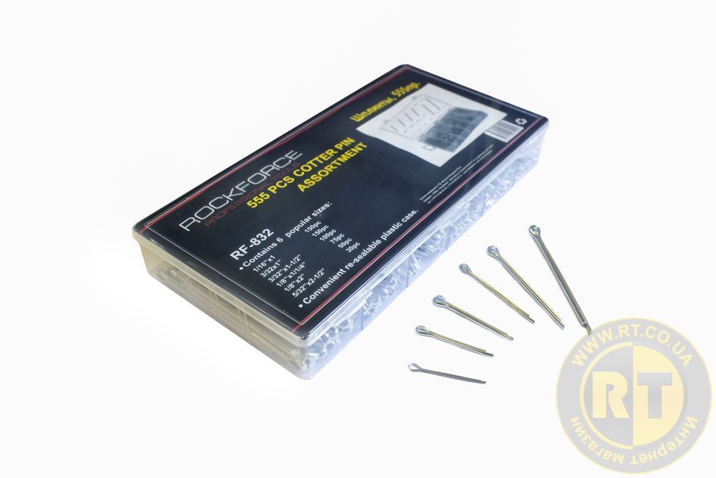 Набір шплінтів ROCKFORCE RF-832 складається з 555 S-головок x L розміром 1,6 x 25, 2,3 x 25, 2,3 x 38, 3,1 x 32, 3,1 x 50, 4 x 63 мм. Шплінти використовують для блокування штифтів, гайок та шайб, щоб запобігти ослабленню з'єднання.