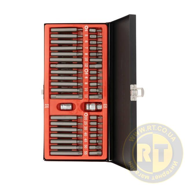 Весь набір поміщений у міцний металевий кейс, який закривається металевим замком. Його зручно транспортувати та зберігати, всі насадки розміщені у персональних маркованих відділеннях – ви швидко знайдете необхідну біту.