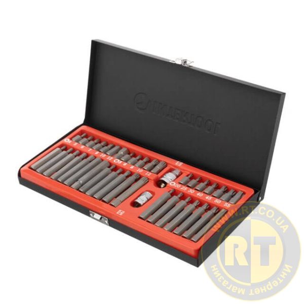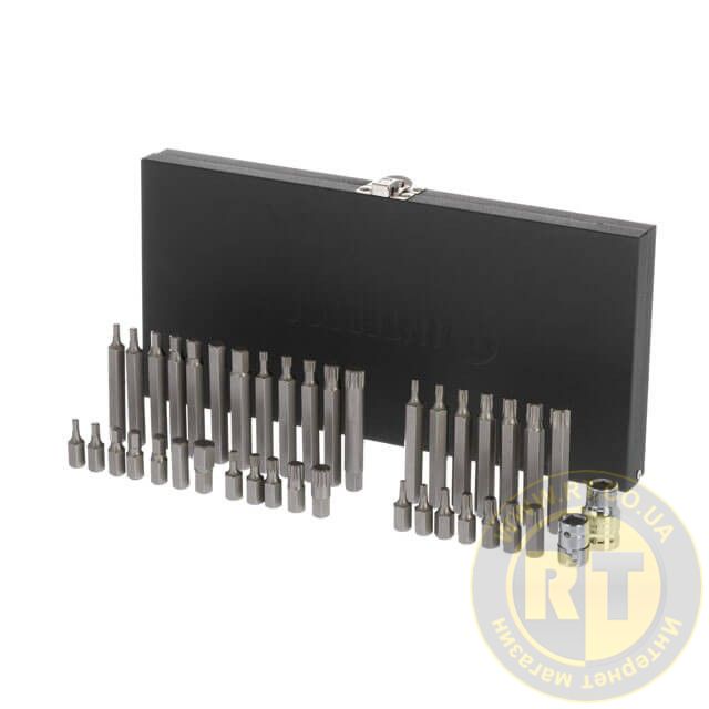 Набір складається з 40 предметів. Різноманітність біт та шестигранників (TORX, HEX, Spline) у двох розмірах 30 та 75 мм дозволяють ефективно працювати у важкодоступних місцях та гарантують надійне зчеплення зі шліцом кріплення.