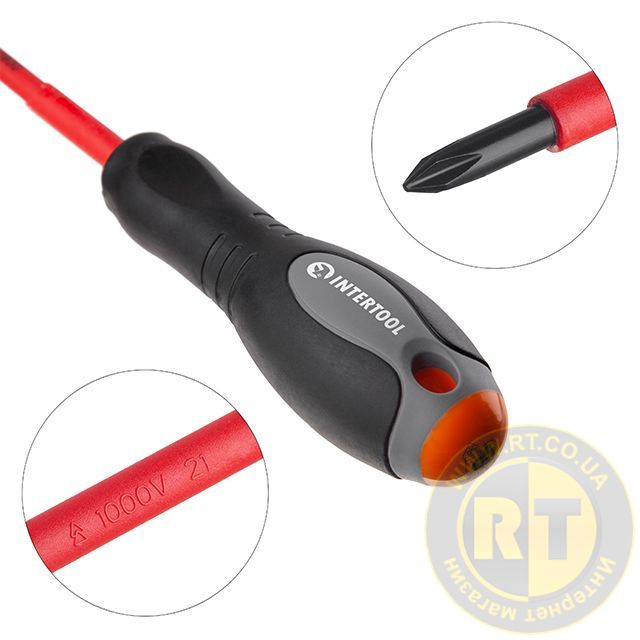 Електроізольована викрутка INTERTOOL призначена для безпечної та зручної роботи з електромережами, запобіжниками, перемикачами та різними приладами, під напругою до 1000 В.