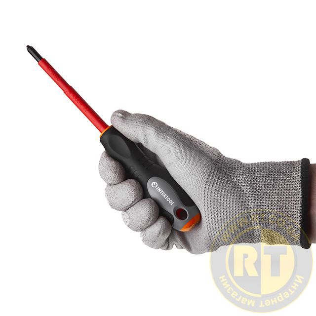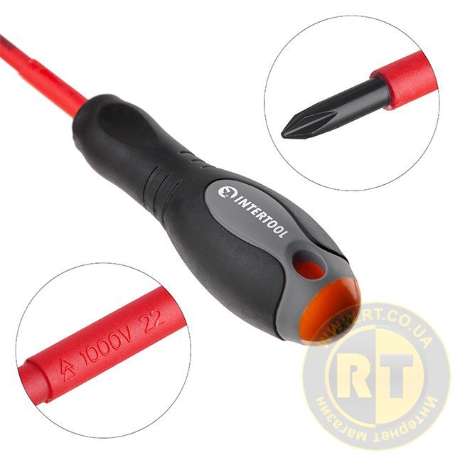 Електроізольована викрутка INTERTOOL призначена для безпечної та зручної роботи з електромережами, запобіжниками, перемикачами та різними приладами, під напругою до 1000 В.