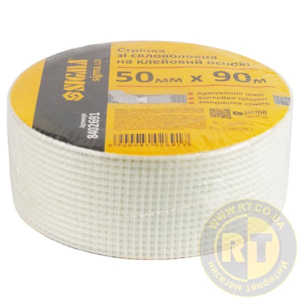 Спеціальна Стрічка склотканина на клейовій основі 50мм×90м SIGMA (8402691) використовується для запобігання утворенню тріщин та зміцнення поверхонь.