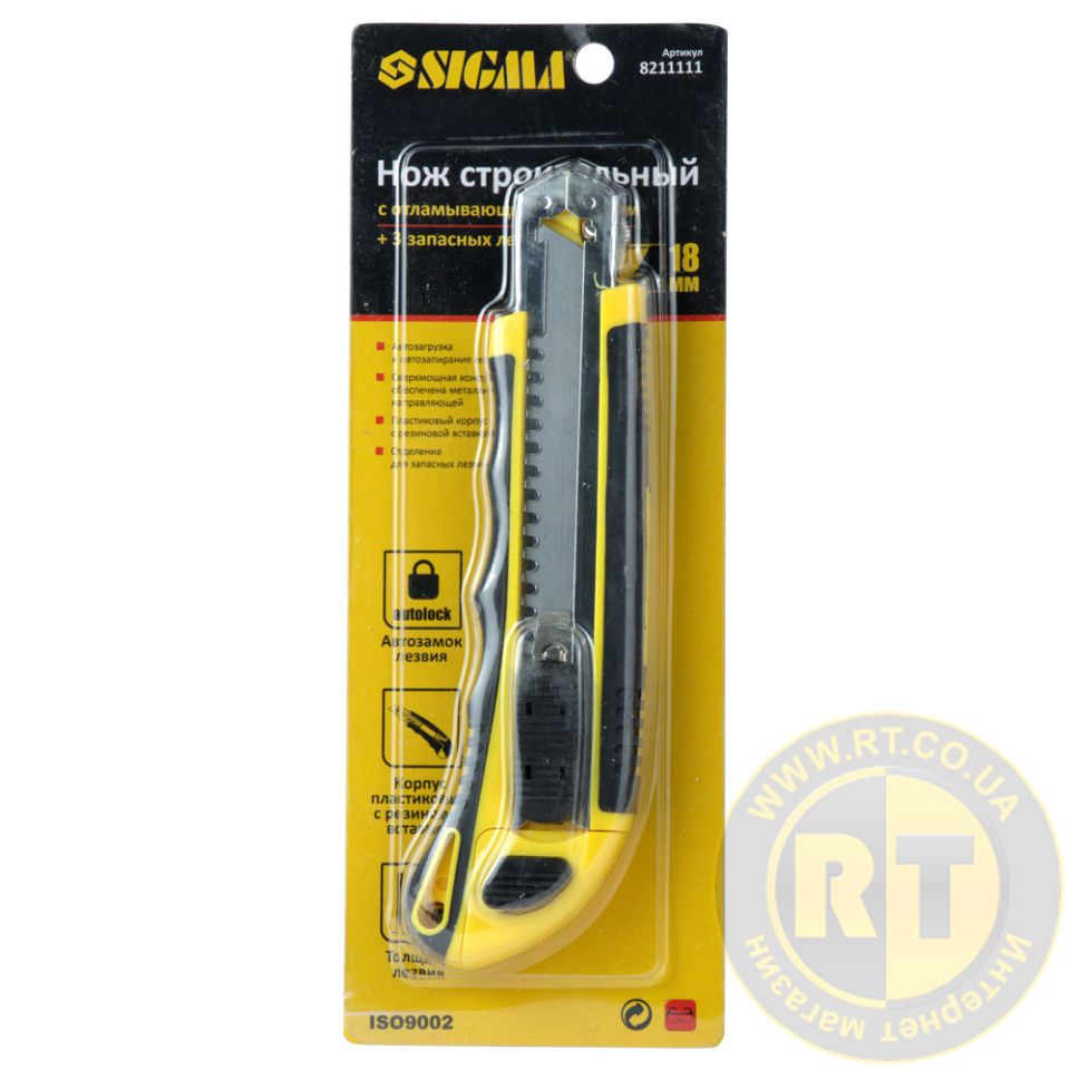 Ніж пластик/гума корпус лезо 3шт 18мм автоматичний замок SIGMA (8211111) призначений для розрізання із застосуванням значних зусиль різних матеріалів: килимових покриттів, картону, тканини, паперу.