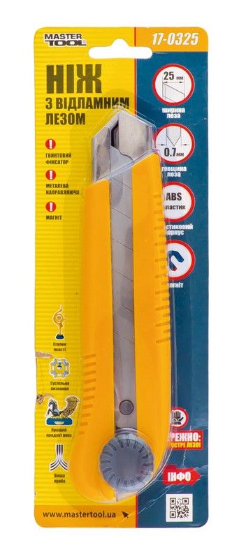Ніж будівельний з відламним лезом 25 мм ABS пластик металева напрямна гвинтовий замок магніт MASTERTOOL 17-0325
