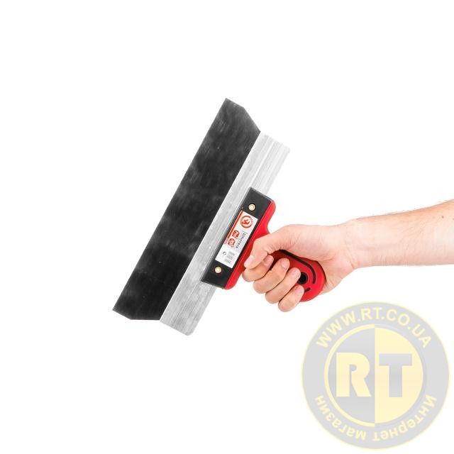 Ручка з пластику та напрямна з алюмінію роблять шпатель досить легким та зручним у використанні. Ручка має спеціальну ергономічну форму, що забезпечує максимально комфортну роботу. Гумове покриття проти ковзання в руках.