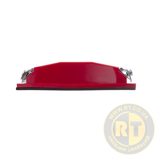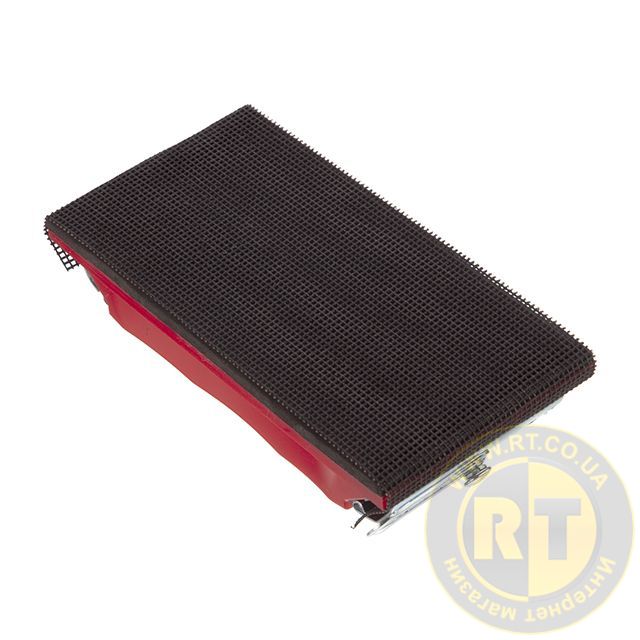 Тримач виготовлений з міцного пластику, розмірами 85*165 мм, гумова поверхня, до якої прилягає сітка, має гарні характеристики пружності, що дозволяють витримати велике докладене зусилля, а збільшена товщина дозволяє забезпечити рівномірне прилягання навіть на дуже нерівних поверхнях. Металеві затискачі щільно притискають абразив, антикорозійна обробка металевих елементів захищає від іржі та дозволяє мити тертку після роботи.