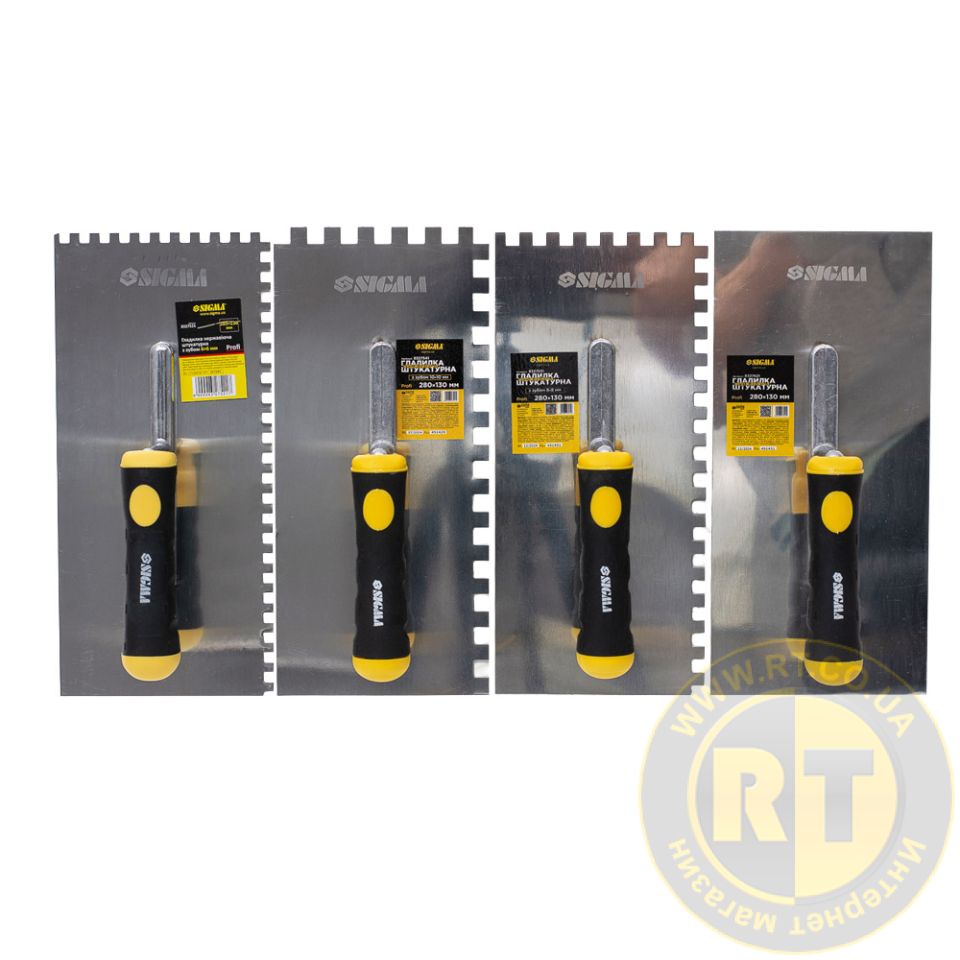 Гладилка нержавіюча штукатурна Profi 280×130мм із зубом 10×10мм SIGMA (8327541) призначена для розгладження відштукатуреної поверхні, а також для рівномірного нанесення клейового розчину при кладці плитки та вирівнювання стін за рахунок використання різних розмірів зубця.
