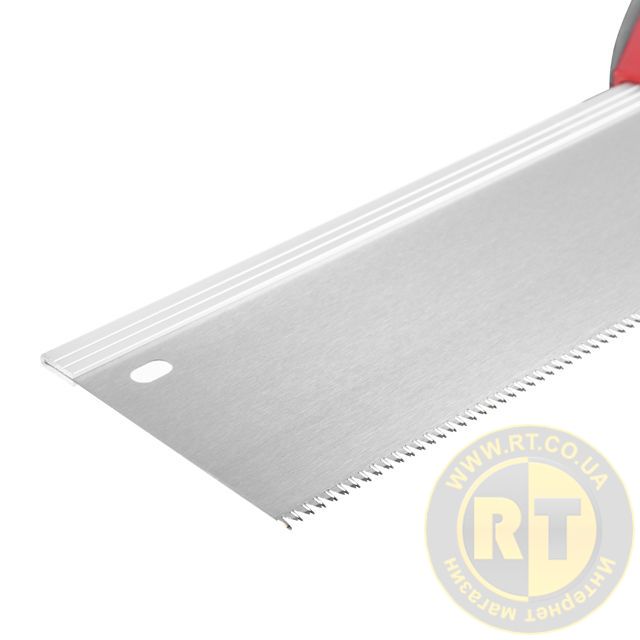 Полотно ножівки виготовлене з високоякісної вуглецевої сталі твердістю 55 HRC. Тристороннє заточування зубів з кроком 12x1" забезпечує швидкий різ. Довжина робочої поверхні — 300 мм. Посилений обушок у поєднанні з потовщеним полотном захищають різальну кромку від деформацій та дозволяють більш точно виконувати розпилювання.