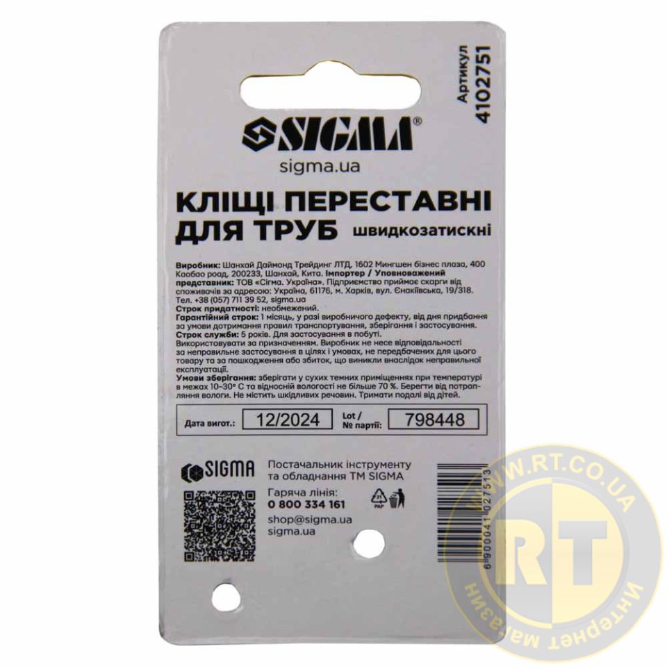 Кліщі переставні швидкозатискні для труб 250мм SIGMA 4102751