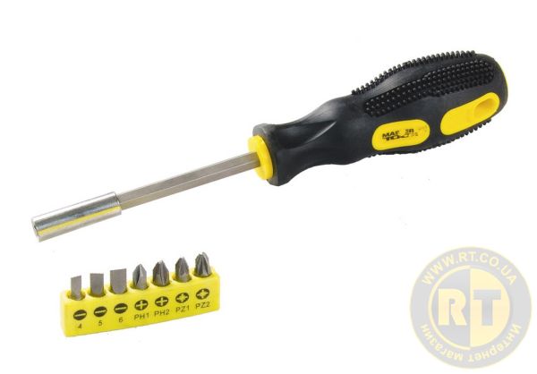 Викрутка магнітна 7-в-1 PH1-2 / SL4-5-6 / PZ1-2 довжиною 250 мм - універсальний інструмент для виконання широкого спектру монтажних та ремонтних робіт. Оснащена комплектом змінних насадок довжиною 25 мм, що дозволяє швидко вибирати потрібний тип шліцю для різних завдань.