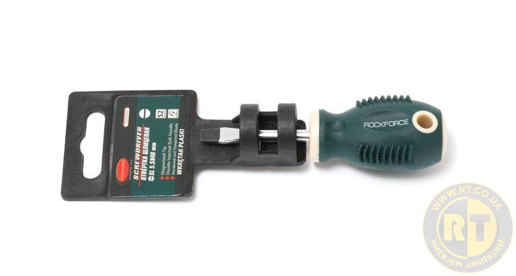Шлицева викрутка ROCKFORCE RF-7035540 магнітна "Profi" S2 5.5x40 мм, на пластиковому тримачі спрощує монтаж і демонтаж кріплення.