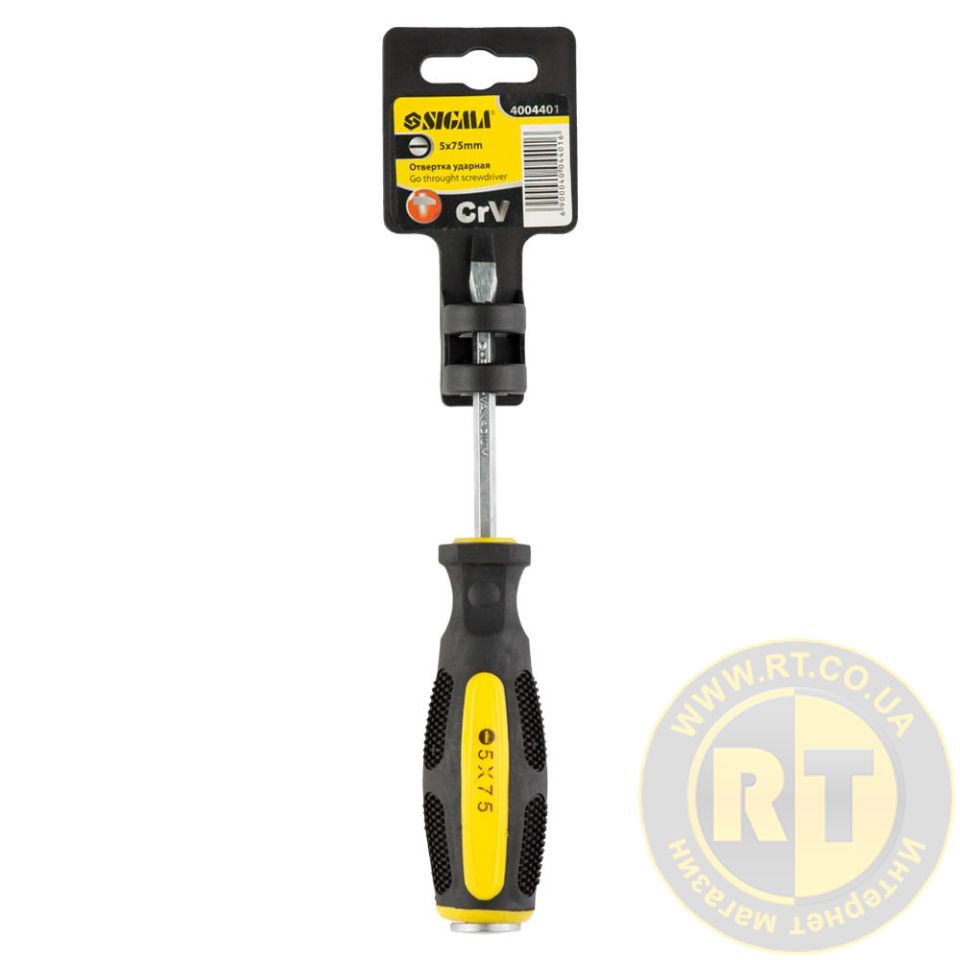 Викрутка ударна шліцьова SL5x75мм CrV Sigma (4004401) на відміну від звичайних викруток, крім основних завдань, пов'язаних із закручуванням та викручуванням кріпильних виробів, дозволяє відкручувати іржаві гвинти та шурупи, за допомогою нанесення ударів по викрутці.