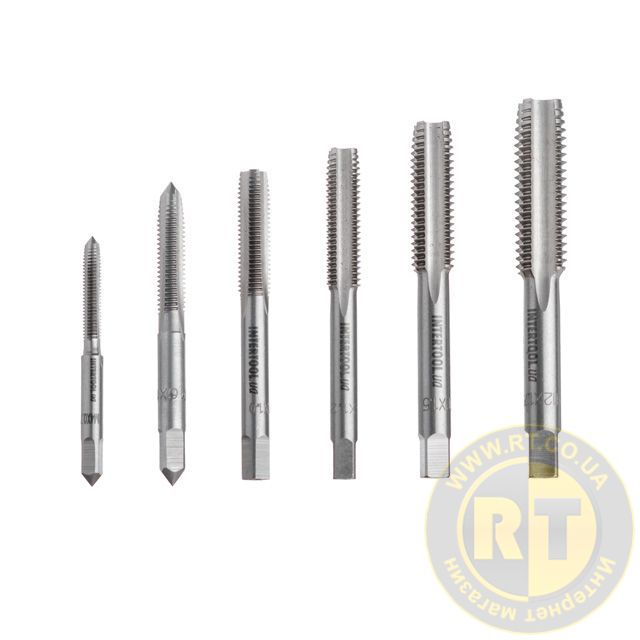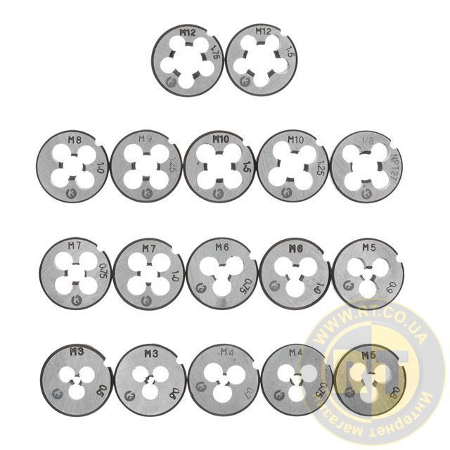 Розміри мітчиків і плашок: М3х0.5, М3х0.6, М4х0.7, М4х0.75, М5х0.8, М5х0.9, М6х1.0, М6х0.75, М7х1.0, М7х0.75, М8х1.0, М8х1.25, М10х1.25 М10х1.5; М12х1.5, М12х1.75, 1/8”-27;