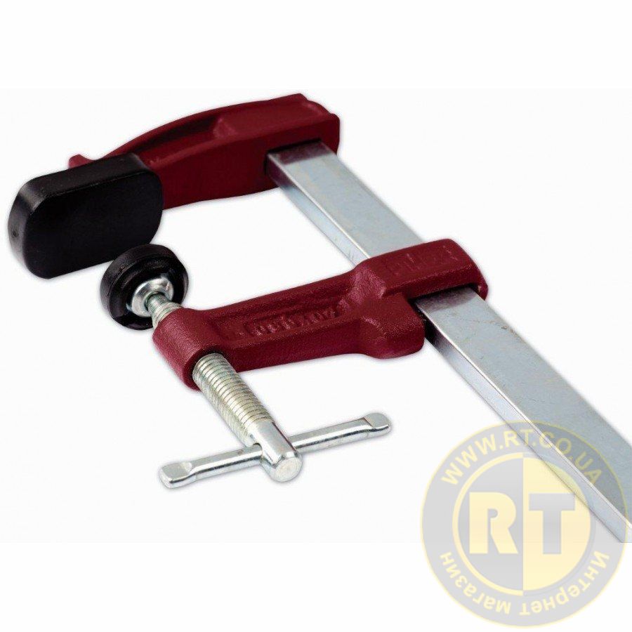 Поршнева струбцина має щоки виготовлені з чавуну та покриті епоксидною фарбою. Супер стійка, завдяки кованій направляючій (90 кг/мм2). Оснащена системою запобігання ковзанню нижньої щоки. Направляюча має антикорозійне покриття. У даній моделі поглиблений діапазон щоки.