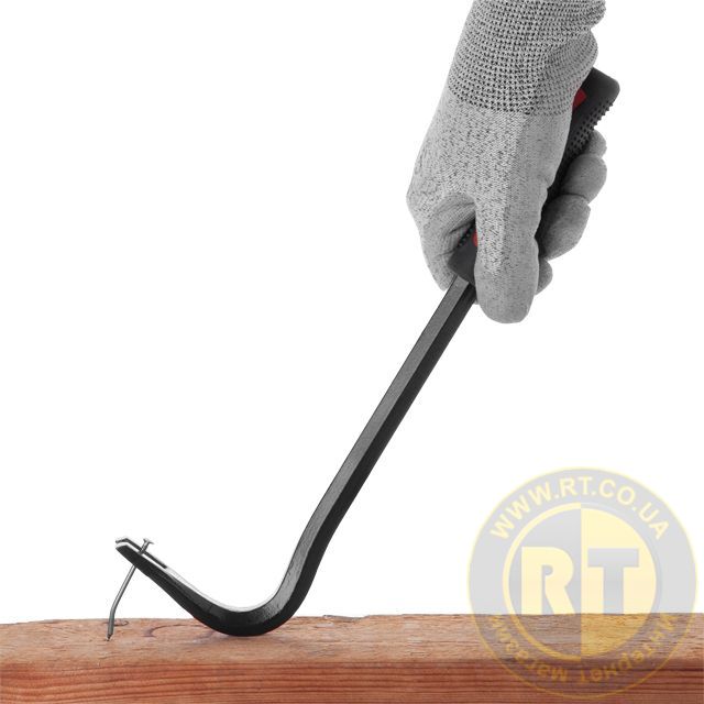 Виготовлений з надміцної загартованої інструментальної сталі для виконання складних демонтажних робіт. Кутовий цвяходер створює опору з високим важелем для піддівання або підйому, а гострий кінець вклинюється у важкодоступні місця.