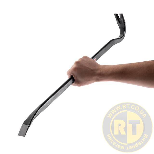 Виготовлений із надміцної загартованої інструментальної сталі для виконання складних демонтажних робіт. Кутовий цвяходер створює опору з високим важелем для зачеплення або підйому, а загострений кінець лома вклинюється у важкодоступні місця. Плоска поверхня цвяходера дозволяє вбивати лом за допомогою молотка.