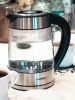 Стеклянный электрочайник с функцией настройки температуры и внутренним светодиодным кольцом, изменяющим цвет во время работы в зависимости от того, насколько горяча вода.