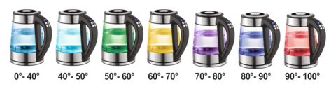 Стеклянный электрочайник с функцией настройки температуры и внутренним светодиодным кольцом, изменяющим цвет во время работы в зависимости от того, насколько горяча вода.