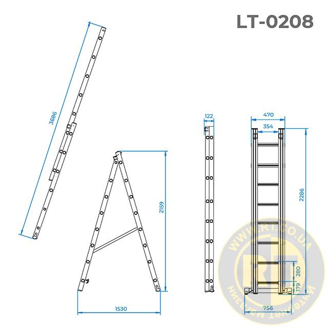 Конструкція дозволяє використовувати її як стрем’янку або як приставні сходи, а в складеному вигляді має невеликі габарити для зберігання. За допомогою ременів та замків безпеки, ви легко зможете встановити сходи у необхідному вам положенні. Функціональність драбини може бути розширена за допомогою додаткової сходинки-полиці LT-6000.
