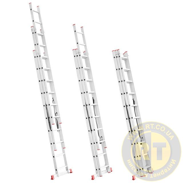 Складана трисекційна драбина стане у пригоді в будь-якій ситуації як професійним майстрам для роботи на висоті, так і для побутових потреб, а також працівникам складів, магазинів тощо. Драбина універсальна і підходить під будь-які завдання, максимальна висота становить 6,77 метрів, при цьому вона може трансформуватися в будь-яке з чотирьох положень. Зручна для використання в домашньому господарстві, наприклад, замінити лампочки, пофарбувати стіни, помити вікна, також її можна використовувати як сходи для дах та ін.