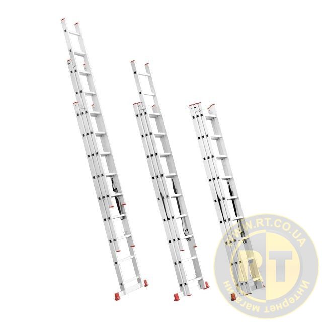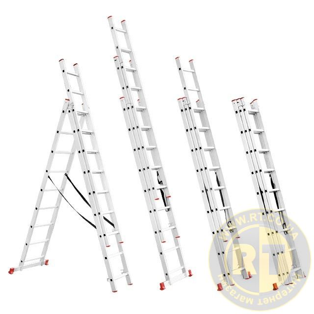 Складана трисекційна драбина стане у пригоді в будь-якій ситуації, як професійним майстрам для роботи на висоті, так і для побутових потреб, а також працівникам складів, магазинів тощо. Драбина універсальна і підходить під будь-які завдання, максимальна висота становить 5,09 метрів, при цьому сходи можуть трансформуватися в будь-яке з чотирьох положень. Вона зручна для використання в домашньому господарстві, наприклад, замінити лампочки, пофарбувати стіни, помити вікна, також її можна використовувати як сходи на дах та ін.