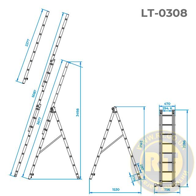 Конструкція дозволяє використовувати її як стрем’янку або як приставні сходи, а в складеному вигляді має невеликі габарити для зберігання. За допомогою ременів та замків безпеки, ви легко зможете встановити сходи у необхідному вам положенні. Функціональність драбини може бути розширена за допомогою додаткової сходинки-полиці LT-6000.