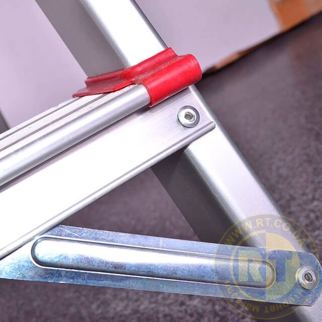 Стрем’янка виготовлена з надійного алюмінієвого профілю, який не іржавіє. В конструкції передбачений замок безпеки, щоб зафіксувати сходи в робочому положенні. Ви можете бути впевнені, сходи не складуться в невідповідний момент. Модель розрахована на тривалий строк служби та відповідає європейському стандарту якості EN131.