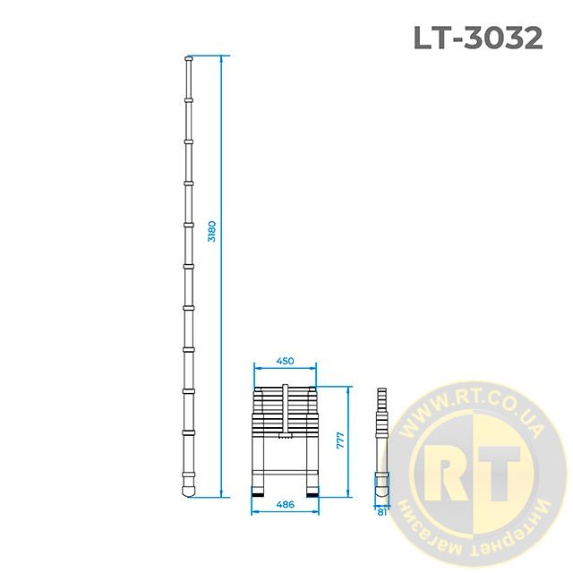 Алюмінієві сходи LT-3032 виготовлені з надміцного, легкого, стійкого до корозії алюмінієвого профілю. Діаметр алюмінієвої труби сходів досягає до 73 мм, а максимальне навантаження становить 150 кг. Сходи стійкі та не ковзають по будь-яких поверхнях, завдяки надійним пластиковим ніжкам, вони також захищають меблі й підлогу від вм'ятин та подряпин. Рифлені сходинки не дадуть нозі зіслизнути під час роботи. Модель розрахована на тривалий термін експлуатації та відповідає європейському стандарту якості EN 131