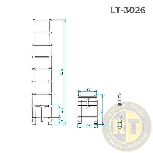 Алюмінієві сходи LT-3026 виготовлені з надміцного, легкого, стійкого до корозії алюмінієвого профілю. Діаметр алюмінієвої труби сходів досягає 73 мм, а максимальне навантаження становить 150 кг. Сходи стійкі та не ковзають по будь-яких поверхнях, завдяки надійним пластиковим ніжкам, вони також захищають меблі й підлогу від ум'ятин та подряпин. Рифлені сходинки не дадуть нозі зісковзнути під час роботи. Модель розрахована на тривалий строк експлуатації та відповідає європейському стандарту якості EN 131.