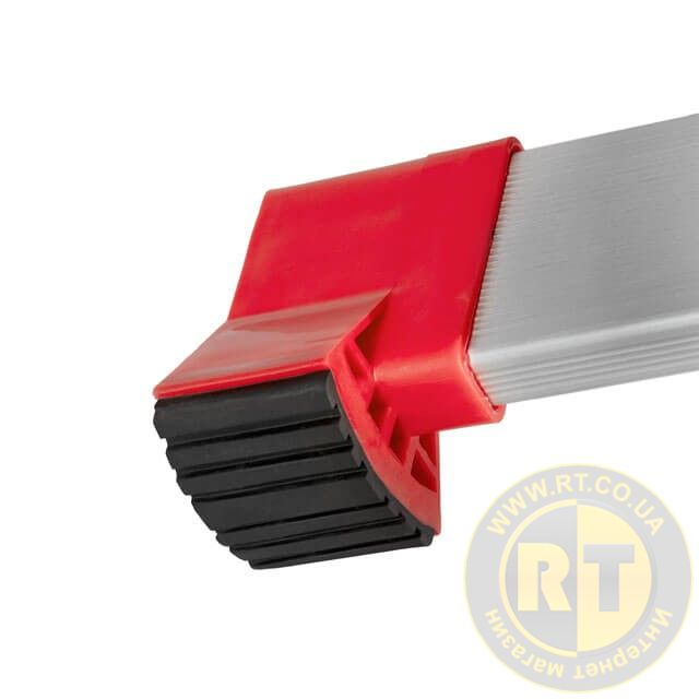 Сталевий профіль забезпечує жорскість конструкції, а також здатність витримати навантаження до 150 кг. Драбина стійка і не ковзає на будь-яких поверхнях завдяки надійним еластичним пластиковим ніжкам. Рифлені сходинки не дадуть нозі зісковзнути під час роботи.