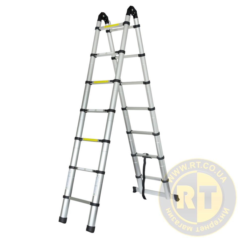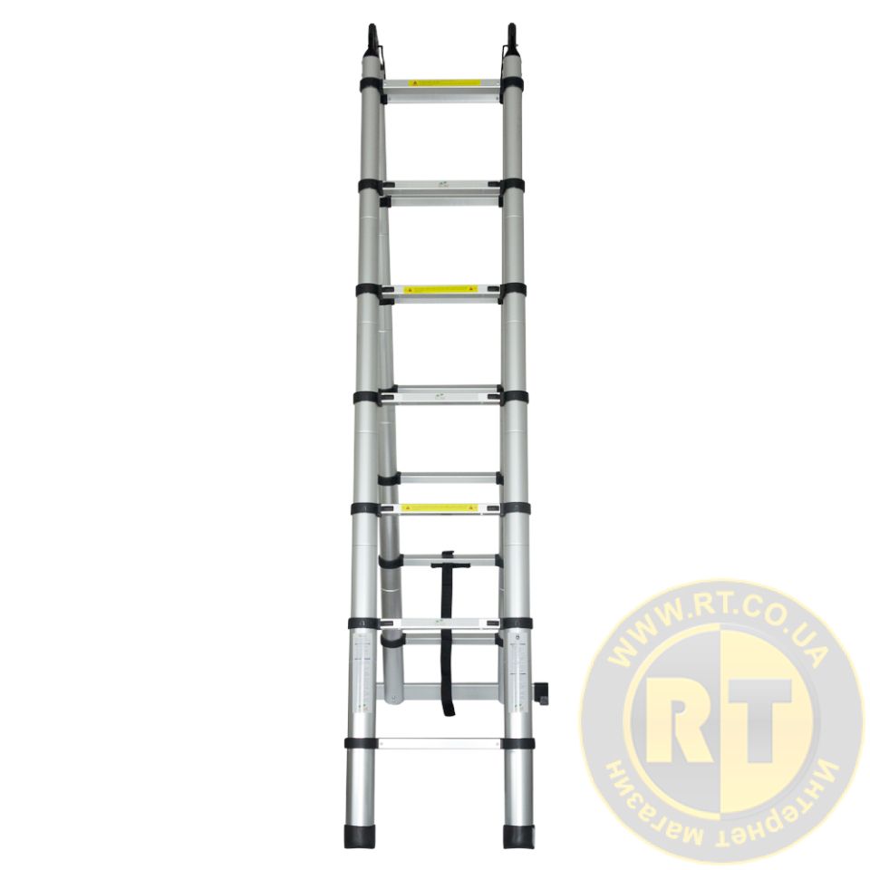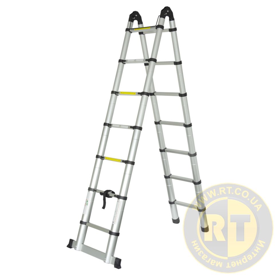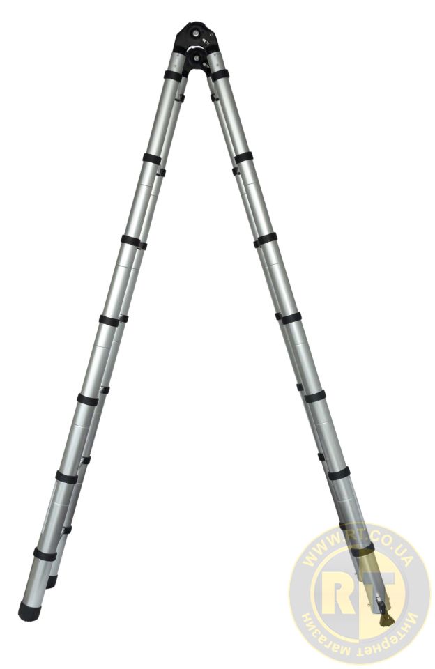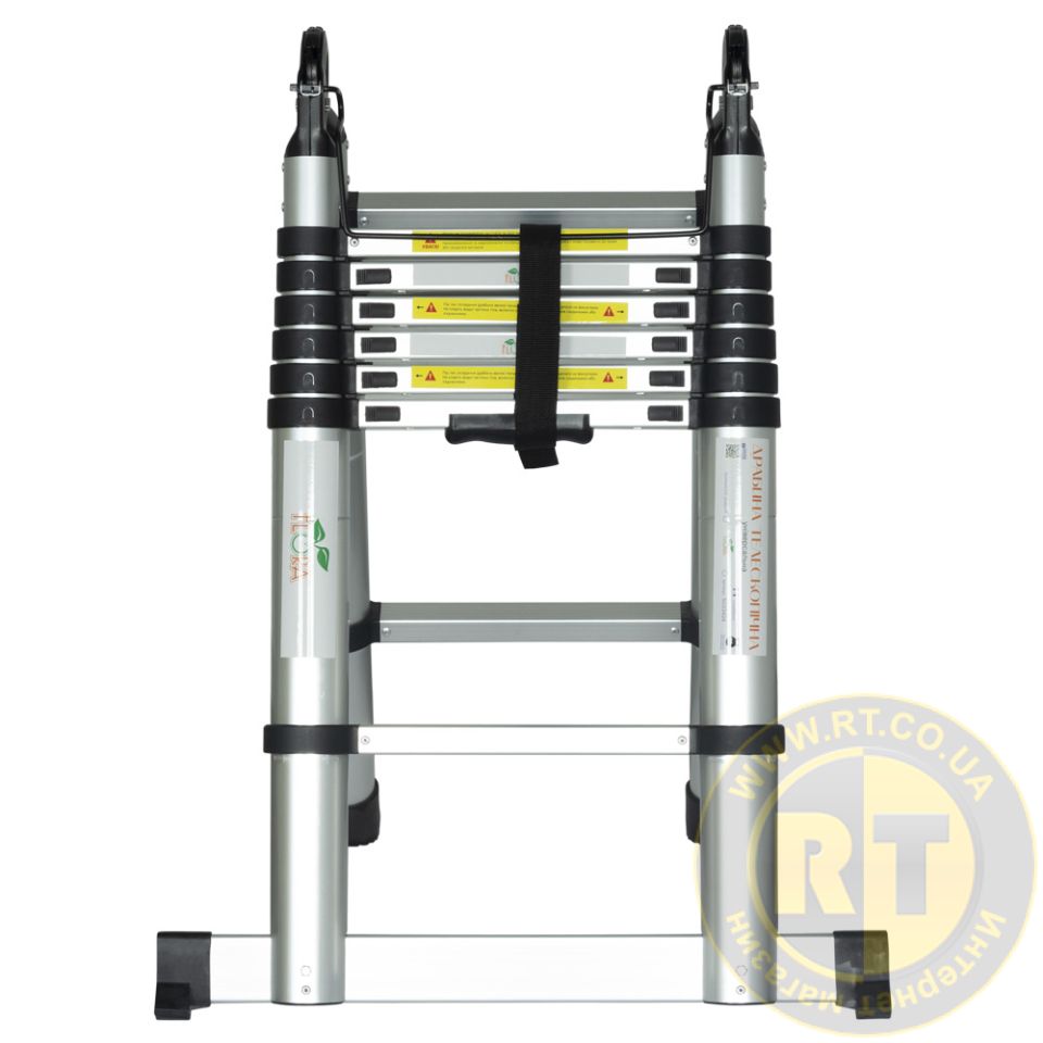 Сходи телескопічні універсальні 2×7 ступенів 4.4м FLORA (5033424) - це розсувна мобільна конструкція, що складається з секцій, які з'єднуються між собою фіксаторами та шарнірами. Форма конструкції може бути у вигляді приставних сходів або драбини.