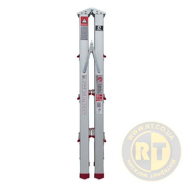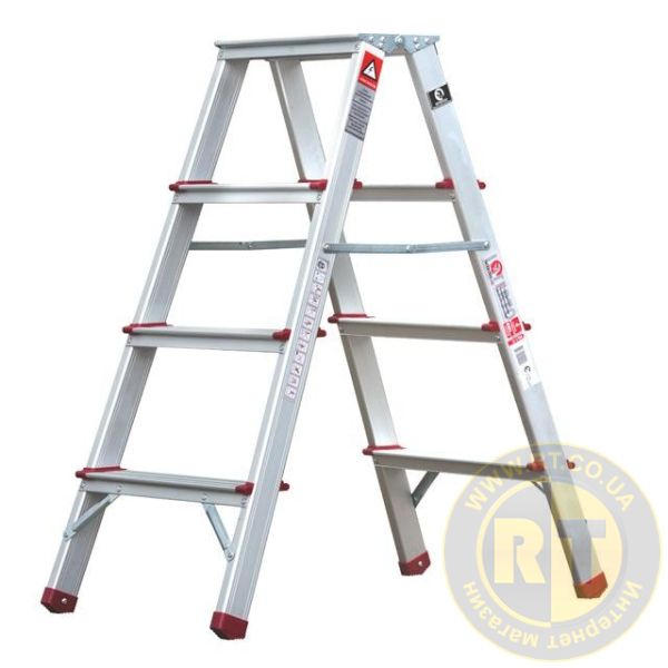 Драбина виготовлена з міцного алюмінієвого профілю, який не іржавіє. Відповідає європейському стандарту EN131 та витримує навантаження до 150 кг. Профільовані широкі (8 см) щаблі не дозволять ковзати нозі. Гарантують безпечний підйом по сходах та зручне положення під час роботи. Сходинки надійно кріпляться до профілю численними заклепками.