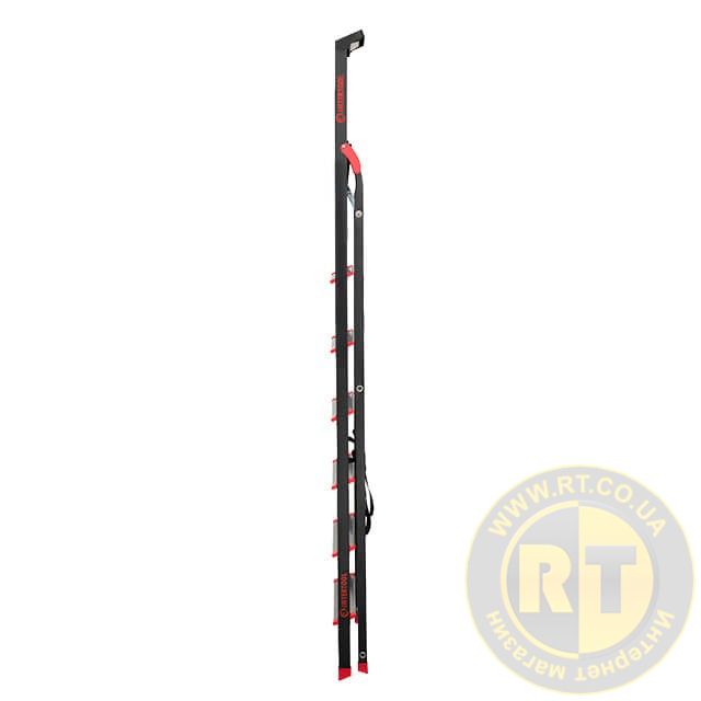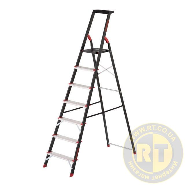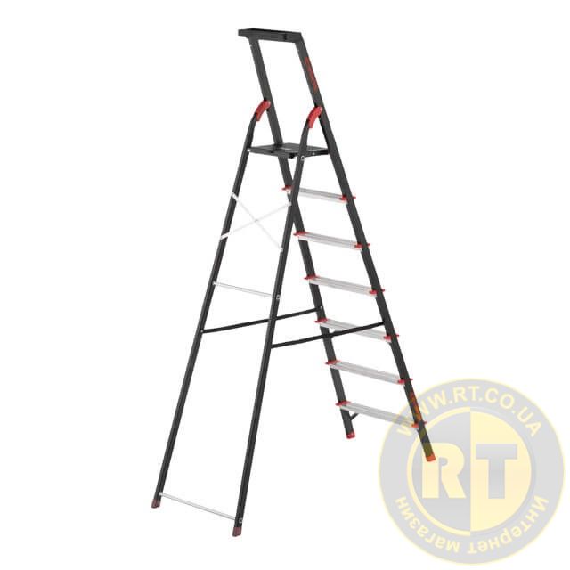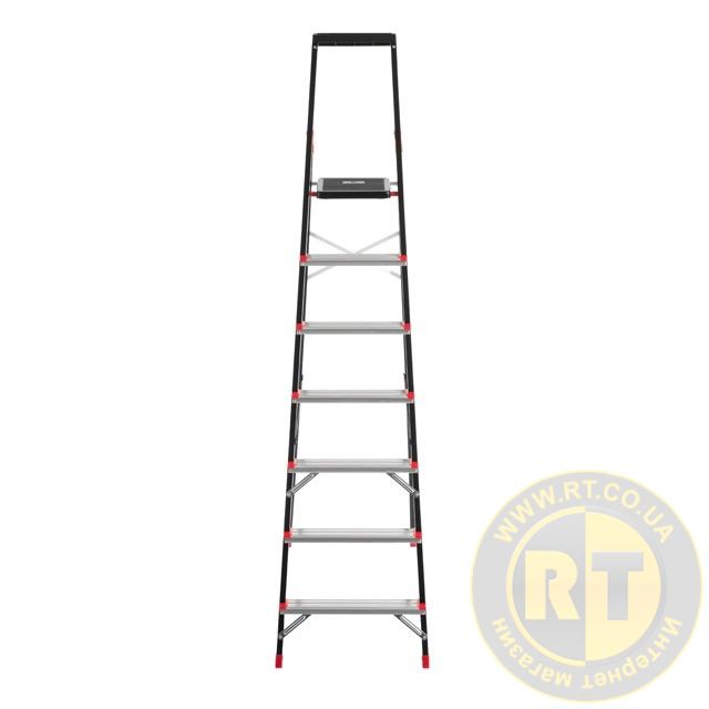 Стрем'янка виготовлена з міцного сталевого профілю з алюмінієвими сходинами. Рифлені сходини не дозволять ковзати нозі та гарантують безпечний підйом, а також зручне положення під час роботи. Стрем'янка відповідає європейському стандарту EN 131 і витримує навантаження до 150 кг.