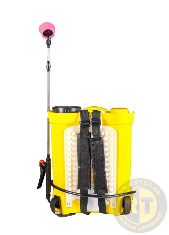 Обприскувач має телескопічну штангу з розпилювачем, гнучкий шланг та регульоване сопло для налаштування типу струменя. Зручні плечові лямки поступово розподіляють навантаження, забезпечуючи комфорт при тривалій роботі. Міцний корпус виготовлений із хімічно стійкого пластику.
