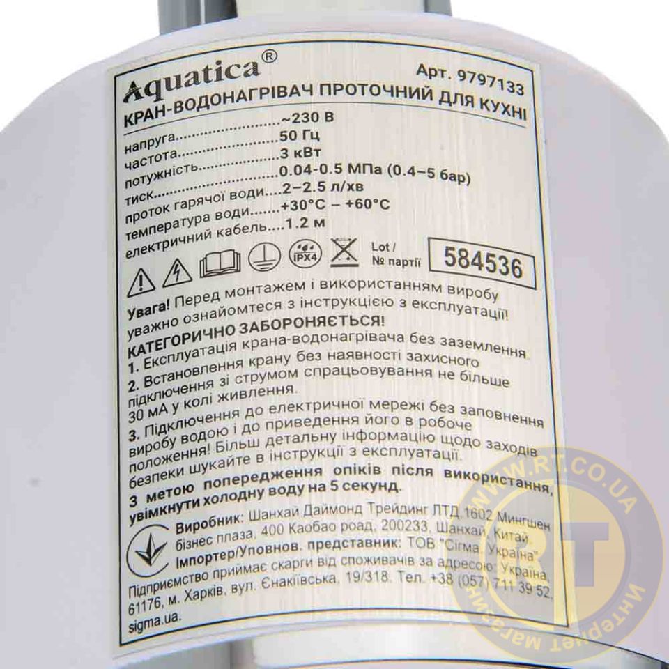 Кран-водонагрівач проточний NZ 3.0кВт 0.4-5бар для кухні гусак вухо на гайці AQUATICA NZ-6B112W (9797133)