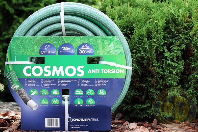 Шестишарові шланги для поливу з підвійним армуванням серії Cosmos виробництва заводу Tecnotubi Італія вирізняються підвищеною еластичністю, стійкістю до механічних навантажень і можуть експлуатуватися в широкому діапазоні температур від +60 до - 10°C. Внутрішній шар не містить шкідливих домішок барію, кадмію та свинцю, що дає змогу використовувати його для різноманітних харчових рідин та питної води.