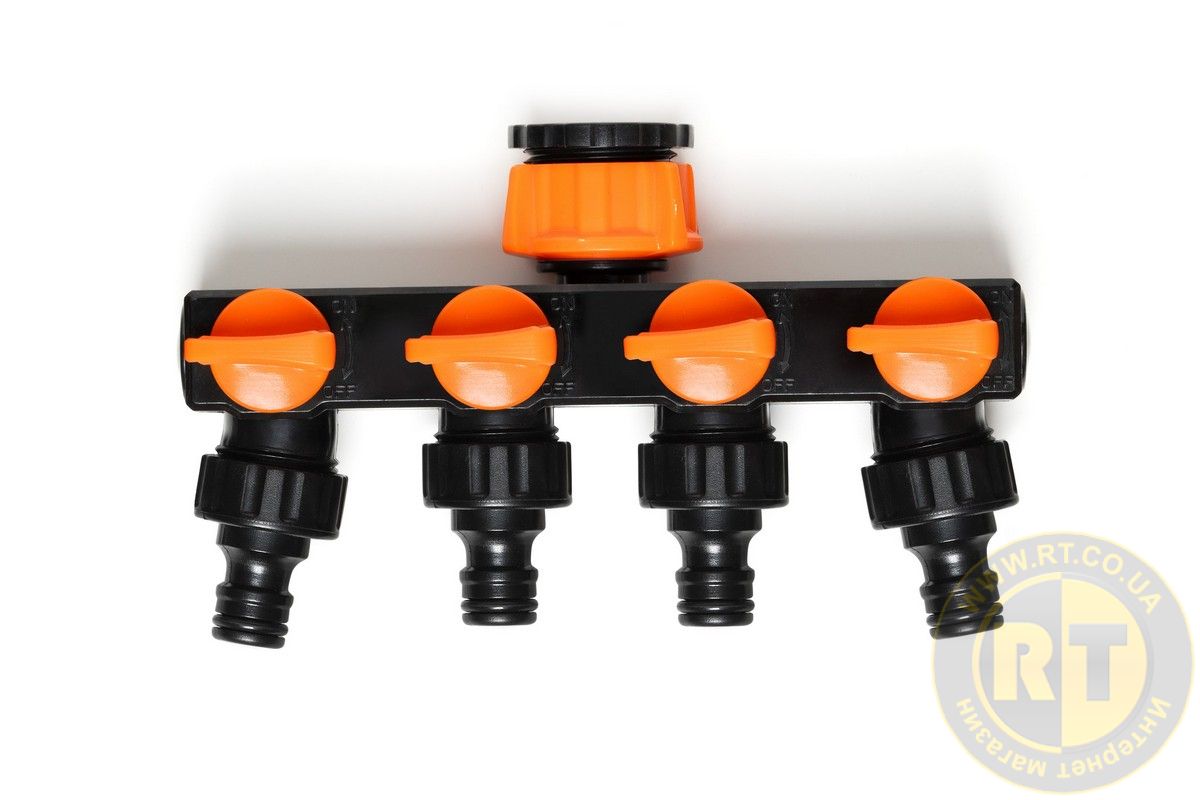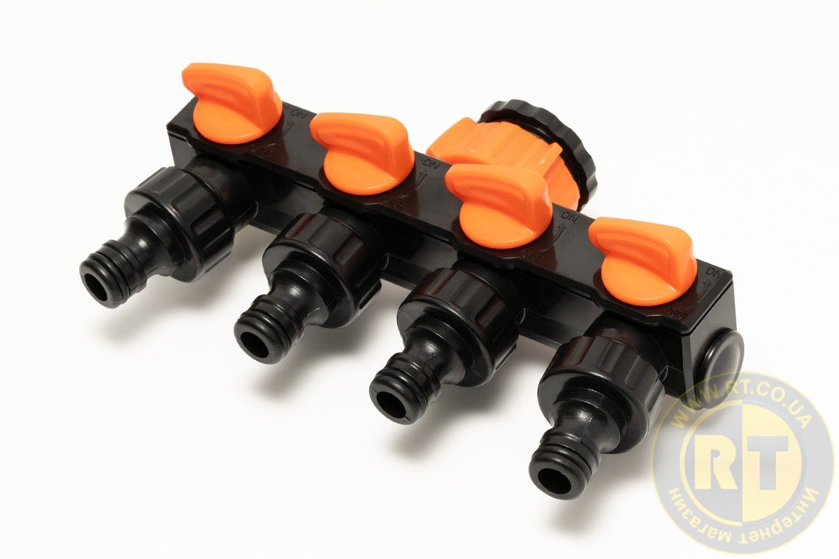 розподільник із вентилями дозволяє підключити до одного джерела води відразу чотири лінії поливу. Кожен канал має індивідуальний регулювальний вентиль, що забезпечує повний контроль подачі води. Ідеальне рішення для складних систем зрошення або одночасного підключення шлангів, зрошувачів, таймерів та крапельних систем.