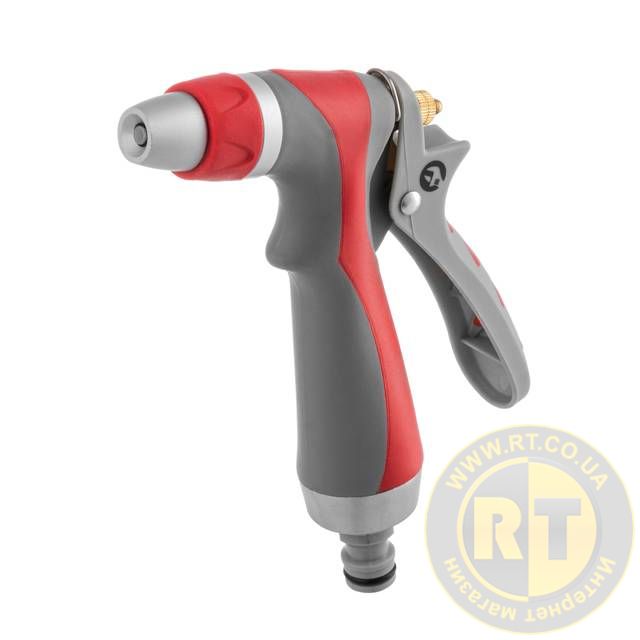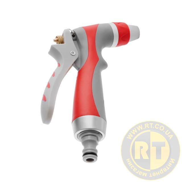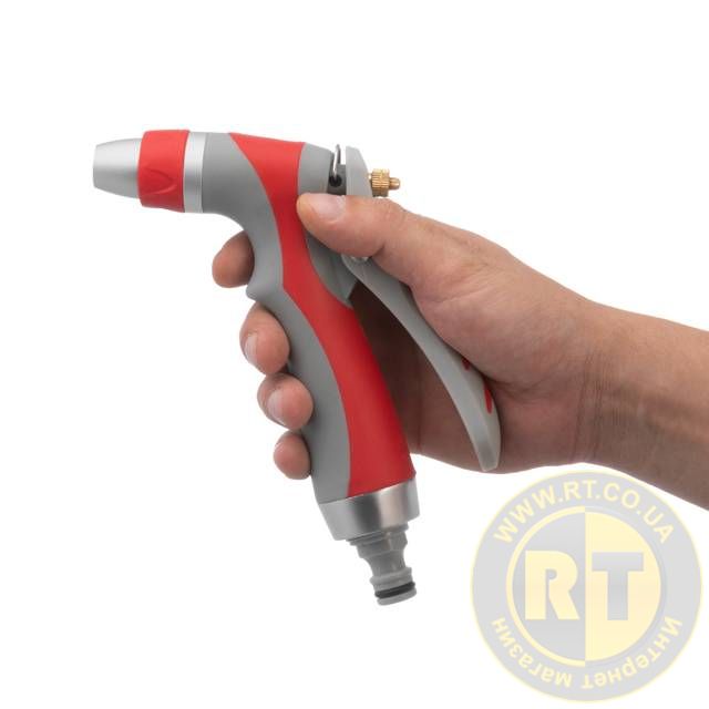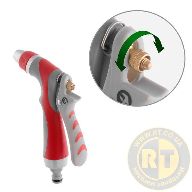 Така насадка для поливу плавно регулює форму струменя в трьох режимах, а також може регулювати потік води за допомогою регулятора над ручкою. Підключається до шлангу за допомогою конектора 1/2". Це простий та надійний зрошувальний аксесуар для будь-якої системи поливу.
