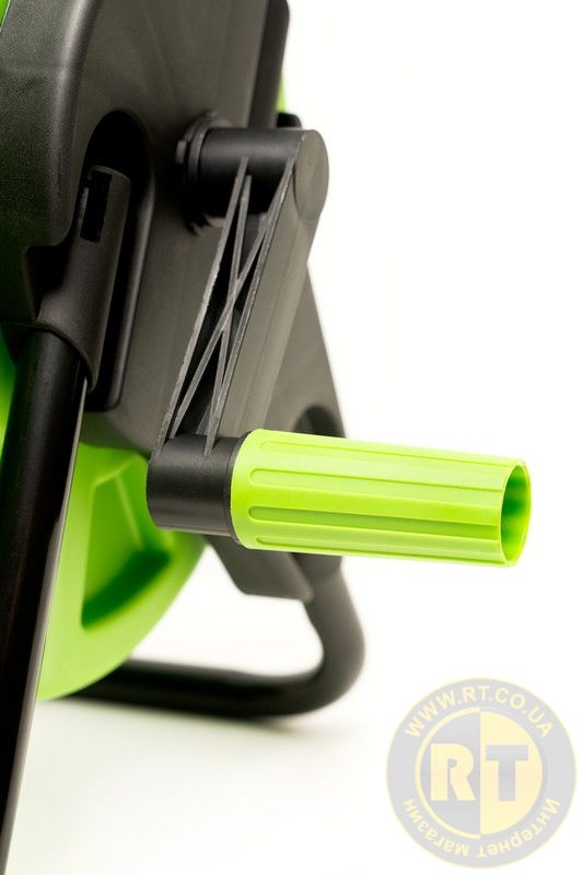 Котушка виготовлена з ударостійкого пластику, стійкого. Оснащена зручною ручкою для змотування, що забезпечує швидке та акуратне укладання шланга