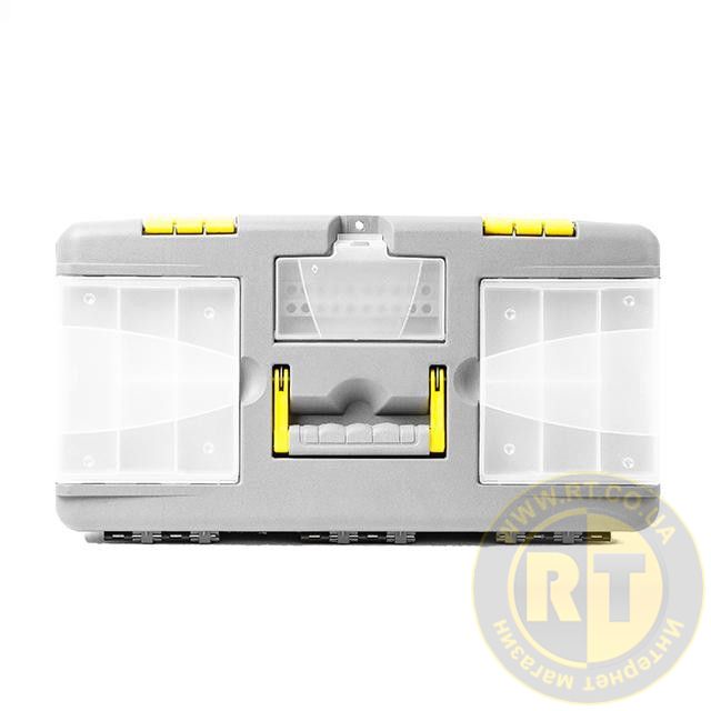 На кришці ящика розташовані два окремі органайзери з різноманітними відсіками, вони можуть зніматися і відмінно підійдуть для зберігання цвяхів, дрібних кріпильних деталей та будь-яких інших дрібних предметів. Також на кришці розташоване відділення для зберігання викруткових насадок. Усередині ящиків розміщений лоток-полиця, який відмінно підійде для зберігання засобів захисту та дрібного інструменту, який часто використовується.