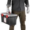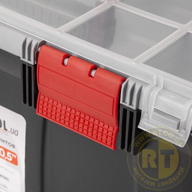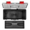 Виготовлений ящик з якісного пластику, стійкого до механічних пошкоджень. Конструкція добре справляється з навантаженнями, тримає форму та не деформується при транспортуванні важких інструментів. Пластикові замки щільно закривають ящик й захищають від випадкового відкриття кришки.